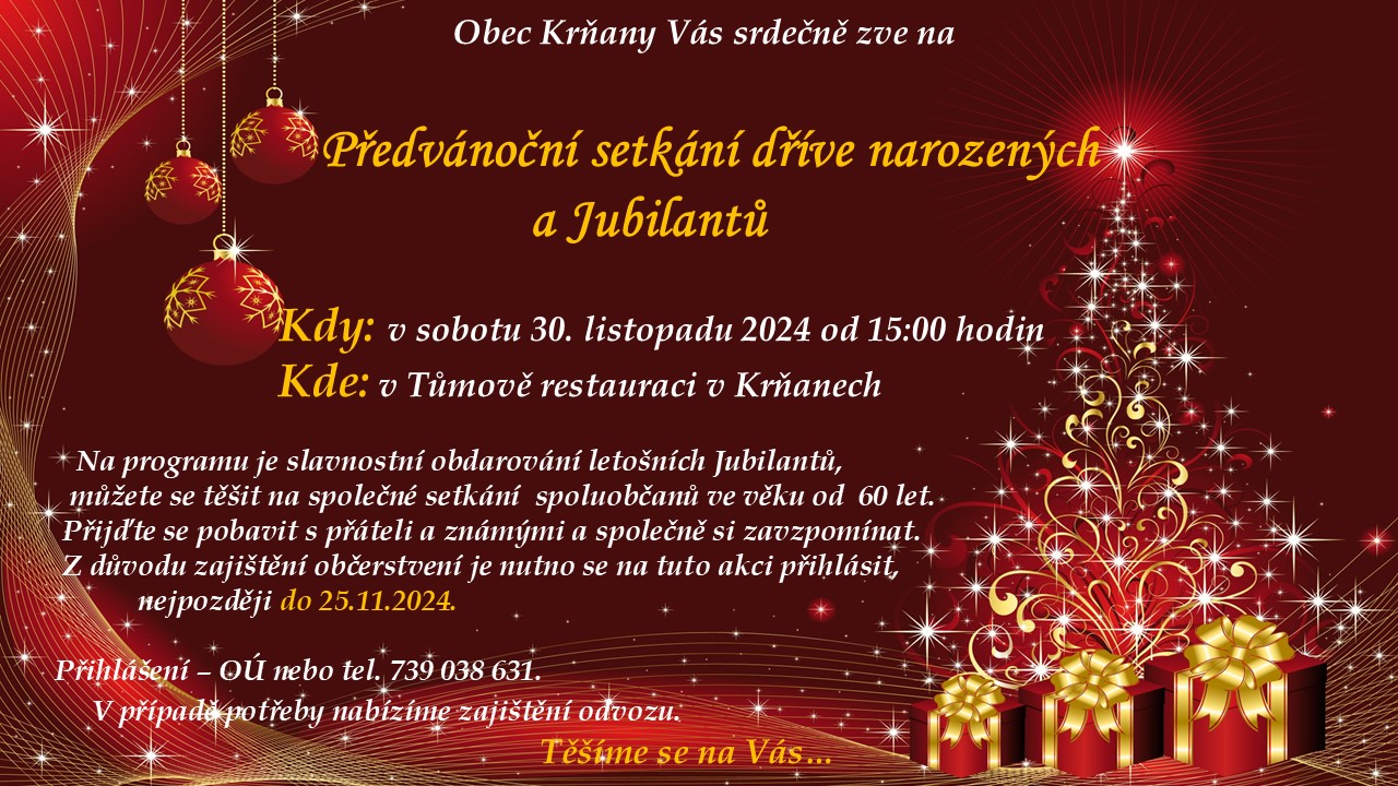Předvánoční setkání dříve narozených a jubilantů 30.11.2024 od 15:00 hod. v Tůmově restauraci v Krňanech.